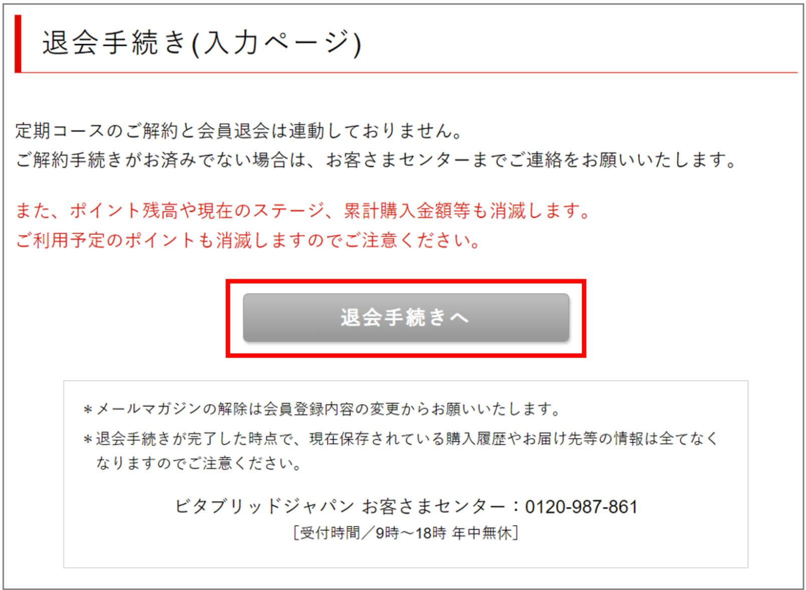 4. 退会手続き(入力ページ)に記載の注意事項をご確認の上【退会手続きへ】ボタンをクリック