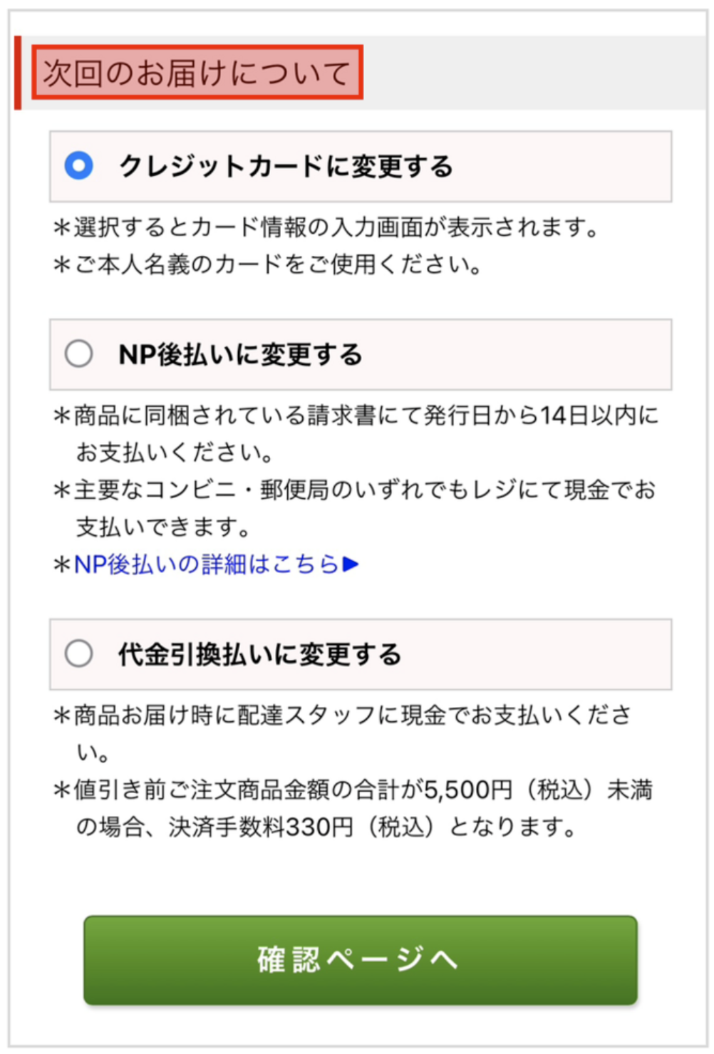 3. 「次回のお届けについて」からご希望のお支払い方法をご登録いただく